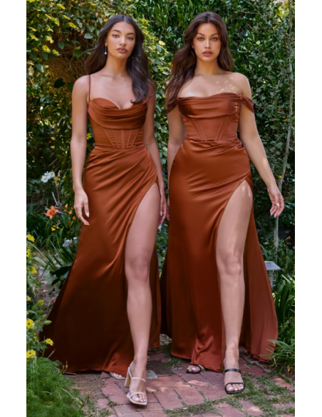 Dress with a structured, draped bodice and boning. Optional spaghetti straps add support to this off-the-shoulder look. A sensual leg slit completes the look. Ideal for bridesmaids, evening wear, and special events.