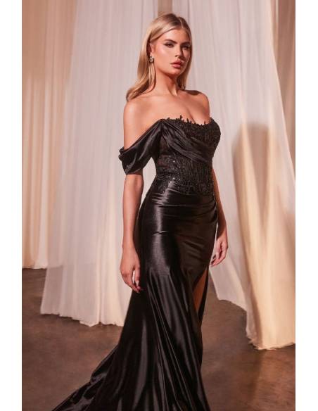 A stunning satin evening dress: a blend of elegance and glamour that will make you feel radiant and confident. The fitted satin silhouette hugs your curves, accentuating your natural beauty with every step. The lace-embellished bodice, with an elegant neckline, adds a touch of romantic allure, while the pleated satin sash elegantly crisscrosses into a single shoulder strap, creating a captivating asymmetrical look. The captivating V-back detail exudes sophistication and grace from every angle. Complete with a gathered satin waist and a sensual leg slit.
