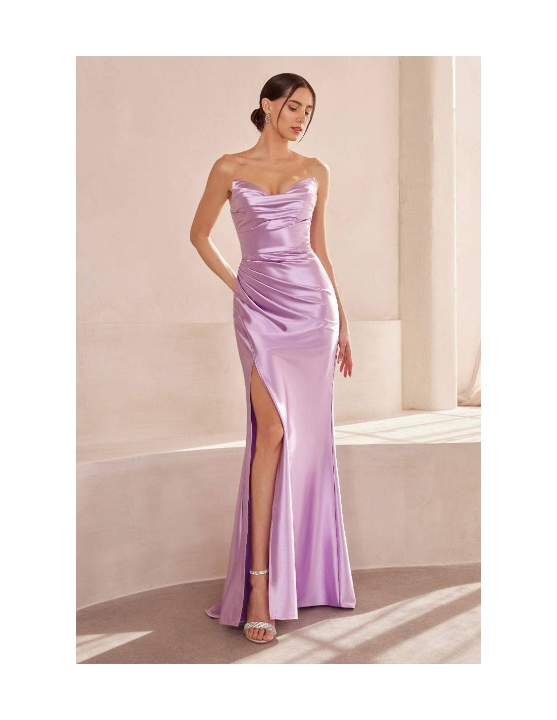 Strapless fitted dress with a corset and décolleté neckline, with gathered sides that accentuate the figure. Semi-stretch satin fabric accentuates the figure, and the slit at the leg adds a touch of glamour. Perfect as a bridesmaid or for an important event, this dress ensures an elegant and refined look.