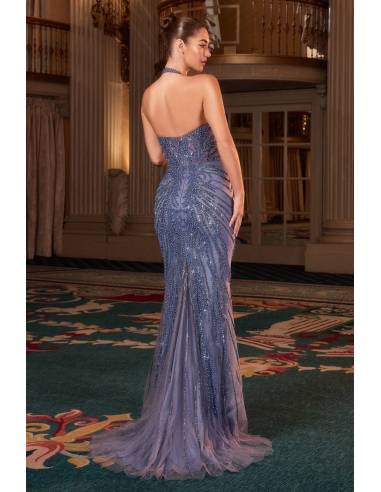 This fitted dress features a sensual halter neckline and a deep illusion mesh bodice, adorned with intricate tonal beading that sparkles from every angle. The sheer overlay glides over the fitted silhouette, complemented by its beading in a refined way. Elegant and sophisticated, this dress is perfect for galas, black-tie weddings, or high-end special events.