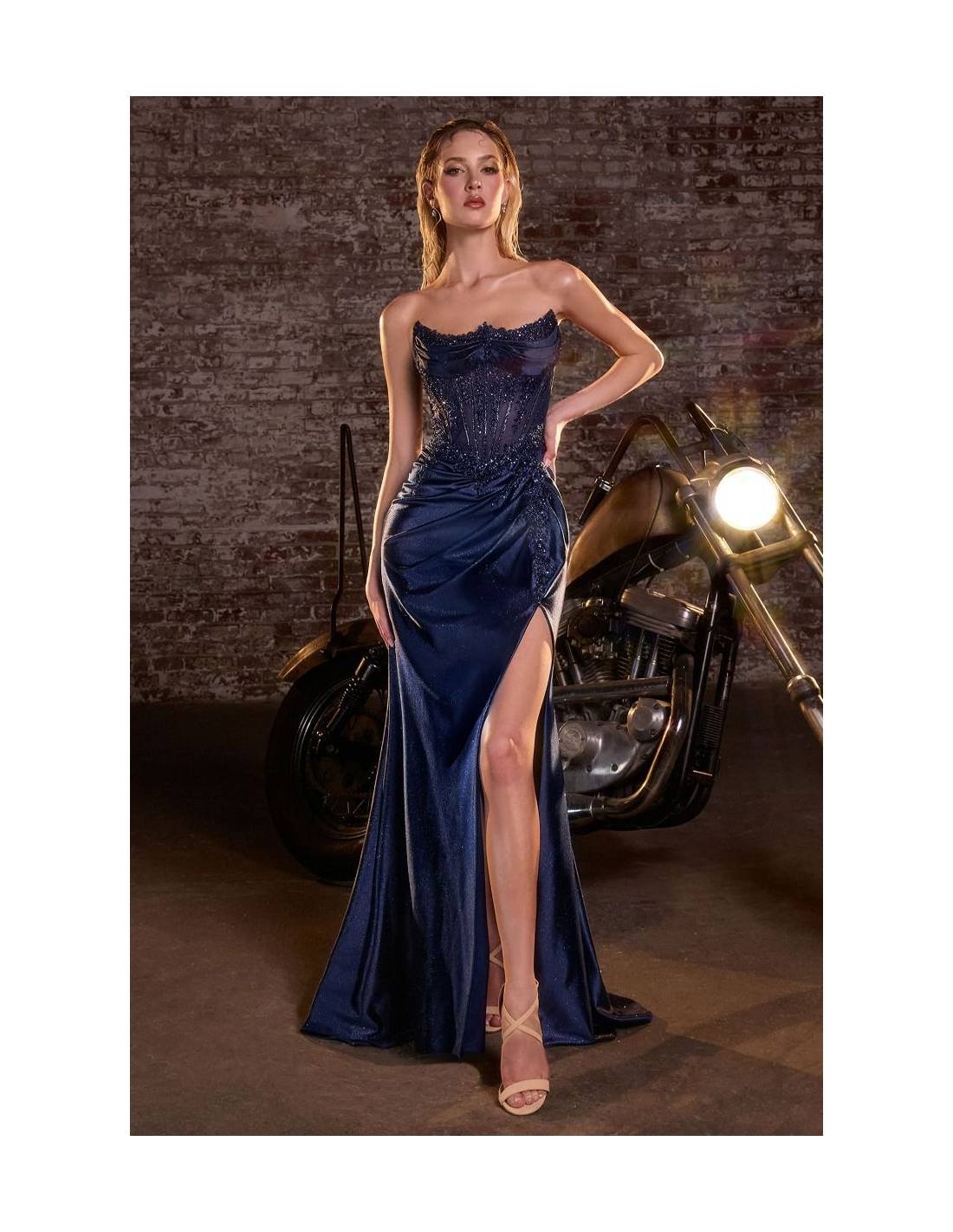 Fitted dress with a strapless sweetheart neckline and an illusion bodice richly decorated with intricate beading. The gathered satin skirt flows elegantly along the hips, culminating in a thigh-high slit that adds movement and a sensual touch. A perfect balance of structure and glamour, this dress is a stunning choice for prom, pageant, or any evening event where sophistication meets bold style.