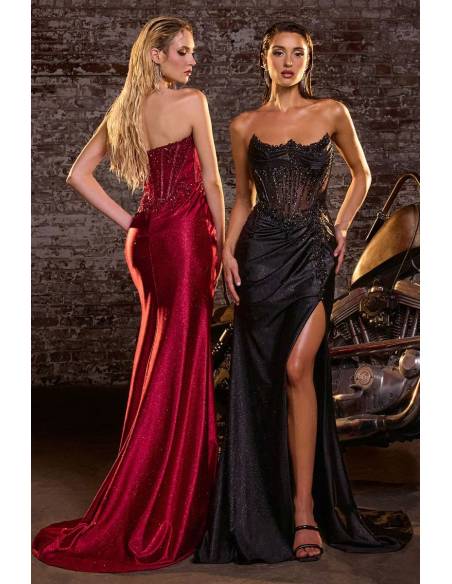 Fitted dress with a strapless sweetheart neckline and an illusion bodice richly decorated with intricate beading. The gathered satin skirt flows elegantly along the hips, culminating in a thigh-high slit that adds movement and a sensual touch. A perfect balance of structure and glamour, this dress is a stunning choice for prom, pageant, or any evening event where sophistication meets bold style.