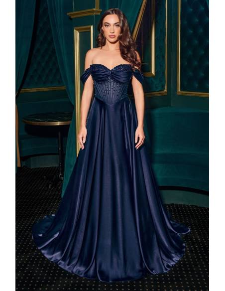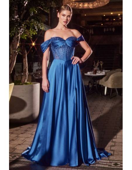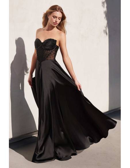 This stunning A-line dress combines a strapless sweetheart neckline for versatile elegance. The intricately beaded bodice features mini floral embellishments, paired with a soft satin skirt featuring a delicate leg slit. Designed with a structured bodice and a lace-up back, it's the ideal choice for any formal event where refined beauty is paramount.