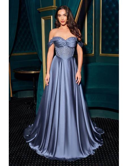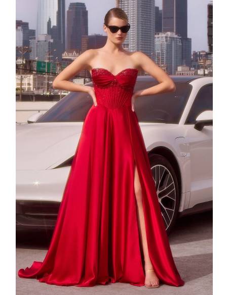 Strapless sweetheart neckline dress, beaded bodice and leg slit, in soft satin and mini floral decorations.