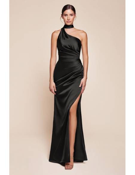 One-shoulder dress with a scarf delicately wrapped around the neck, a sophisticated detail that enhances the elegance of the silhouette. The gathered waist flatters the figure, while the leg slit adds a touch of femininity and movement. Perfect for bridesmaids, wedding guests, and special occasions.