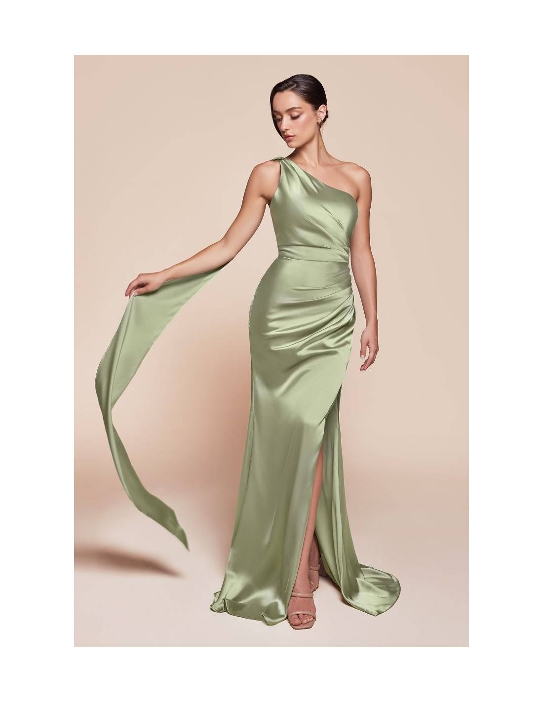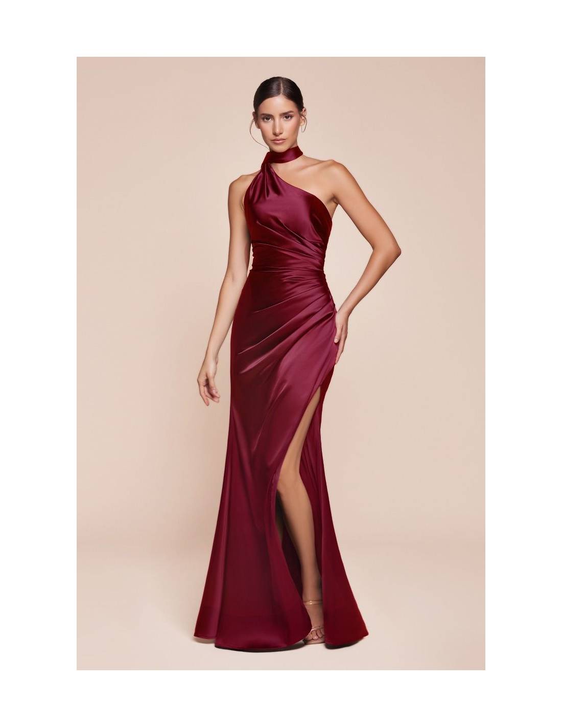 One-shoulder dress with a scarf wrapped around the neck to highlight the sophistication, gathered waist and slit at the leg. Ideal for bridesmaids, wedding guests and special events.