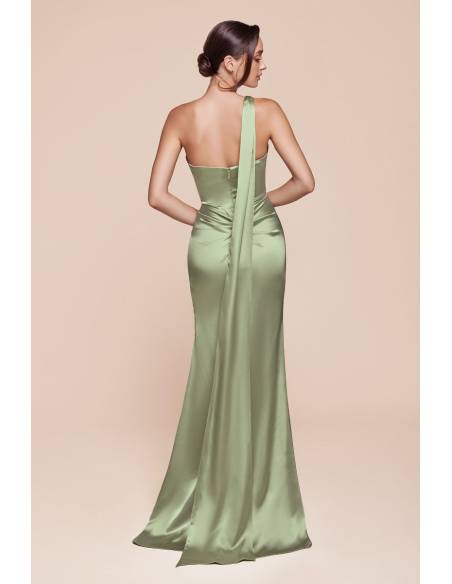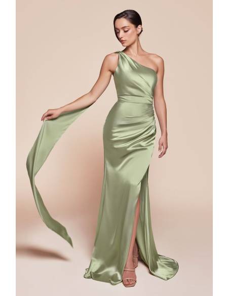 A dress that gently caresses the figure: one shoulder with a flowing scarf, a soft waist that accentuates the figure, and a discreet slit that gracefully reveals femininity.