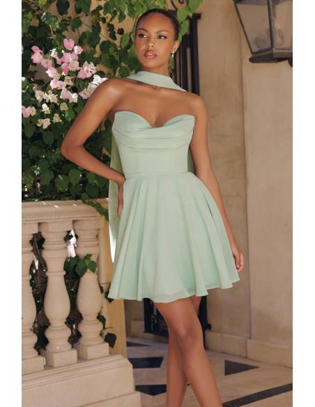 Mini dress with décolleté neckline, lace-up bodice and flared skirt for your fluttering evening.