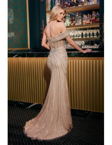 Dress with a fitted silhouette, in tulle with sparkling beads, sweetheart neckline with off-the-shoulders and slit on the leg.