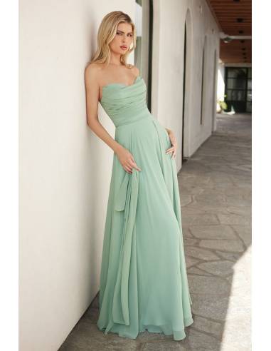 This elegant A-line dress features a strapless sweetheart neckline and draped front for a soft and romantic look. The fitted bodice with a lace-up corset back offers structure and a custom fit, while the flowing skirt moves gracefully with every step. Complete with a delicate scarf accessory, this dress is perfect for weddings, bridesmaids, or any formal event.
