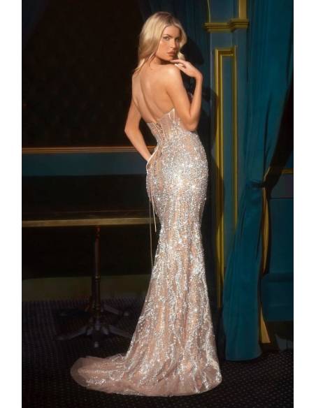 Design glamour ,scollatura profonda senza spalline, corpetto trasparente completamente decorato con perline allacciato dietro