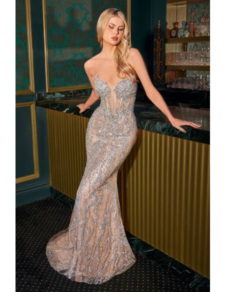 This glamorous strapless fitted dress features a plunging neckline and an illusion bodice embellished with crystal embroidery. A full pearl glitter overlay adds dazzling texture, while the fitted, flared silhouette and halter back sculpt a flawless, confident figure. Perfect for an 18th birthday party, evening gown, or any evening that calls for unforgettable elegance.