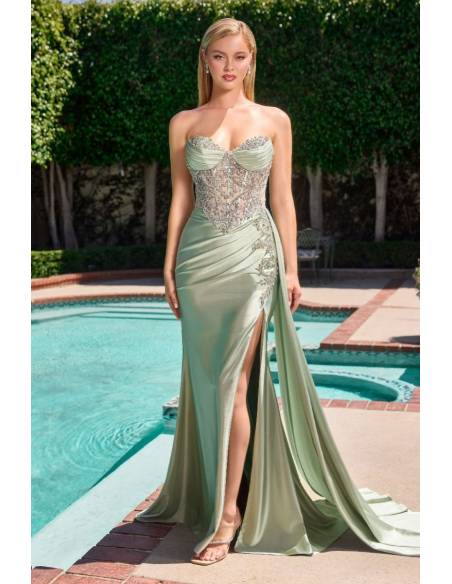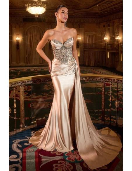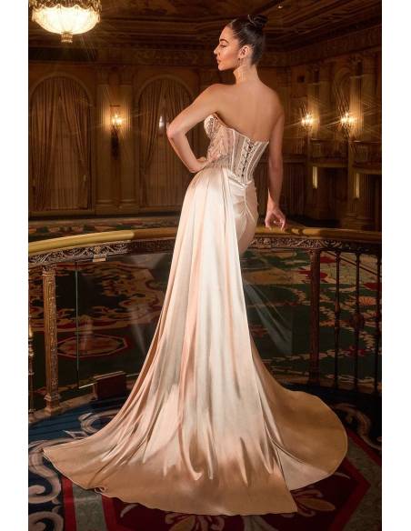 Design: Strapless sweetheart neckline, embellished bodice, leg slit, and satin side band. Fitted silhouette with a structured corset that perfectly supports the bust.