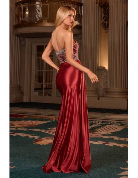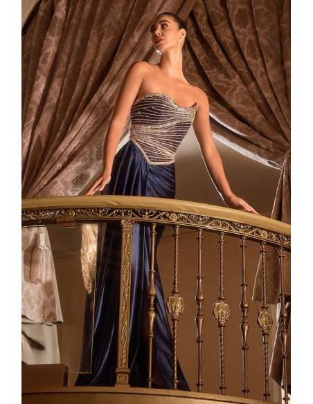 Fitted silhouette, strapless neckline, sparkling bodice, high leg slit ideal for your event.