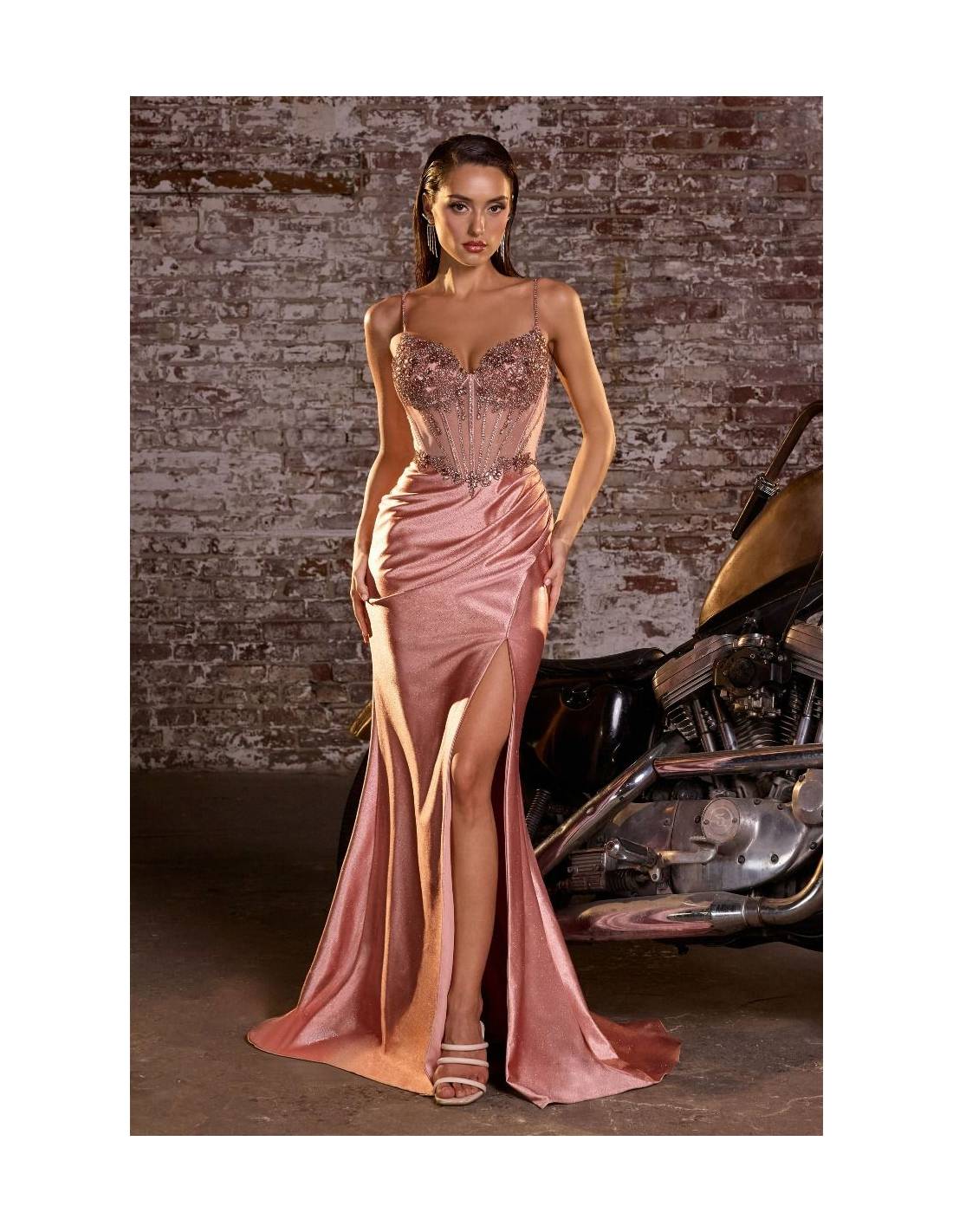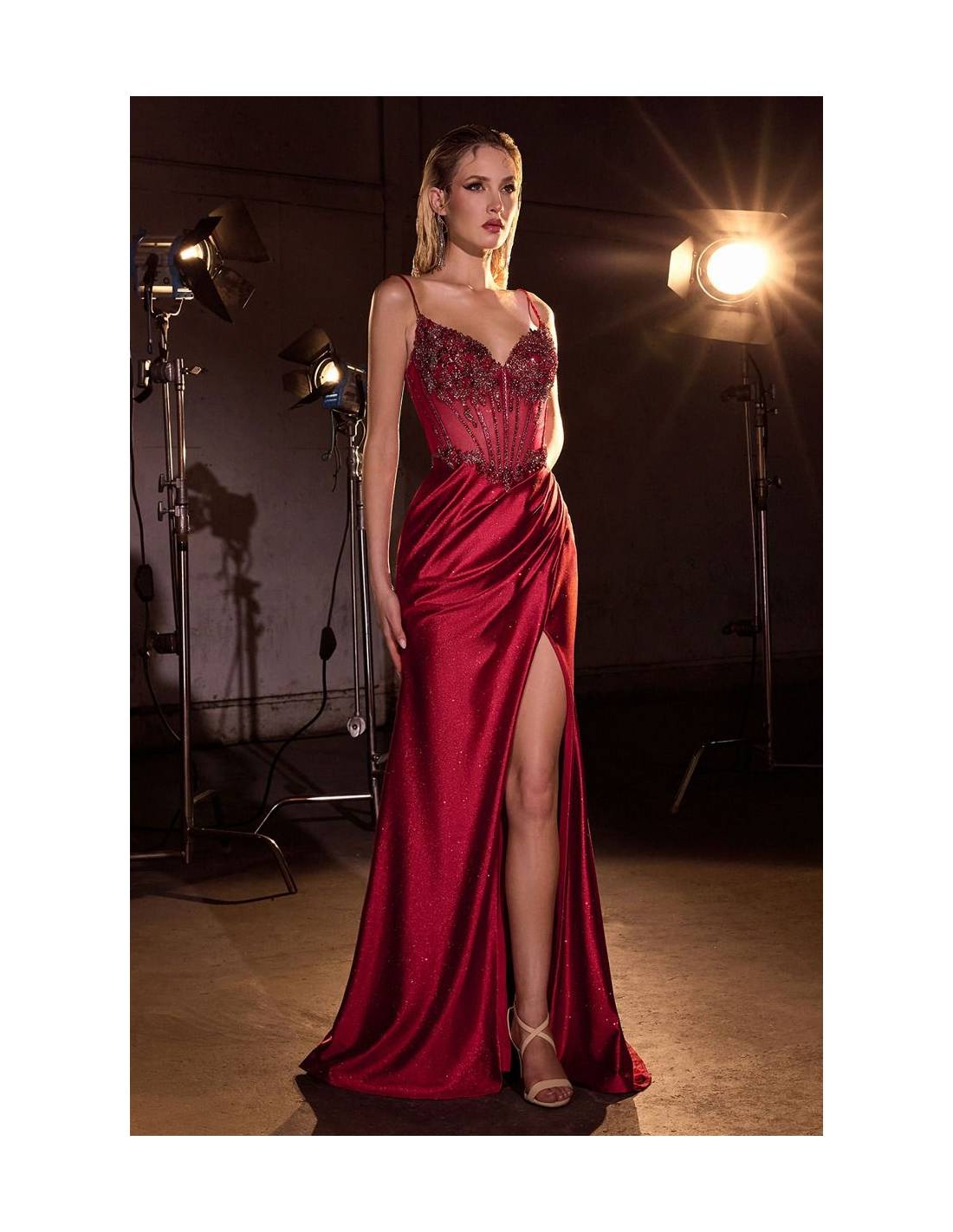 To turn heads, wear this style with its illusion bodice embellished with silver floral beads and delicate spaghetti straps. The sheer bodice highlights volume and shape, while the stretch satin skirt flows into a gathered slit at the hip and leg for a sensual touch. A bold choice you can't miss for prom, gala evenings, or any red carpet event, for the perfect mix of glamour and elegance.