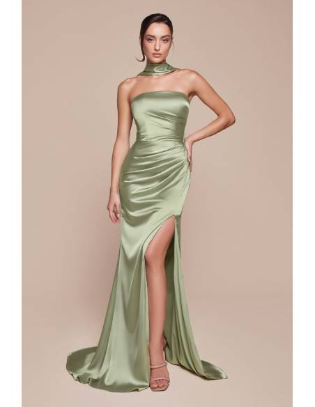 Strapless fitted dress in satin with an elegant neckline, gathered waist, and a chic slit at the leg. The fitted bodice with a halter back offers perfect support and sophistication. Ideal for bridesmaids, wedding guests, or any formal event, this dress offers timeless elegance.