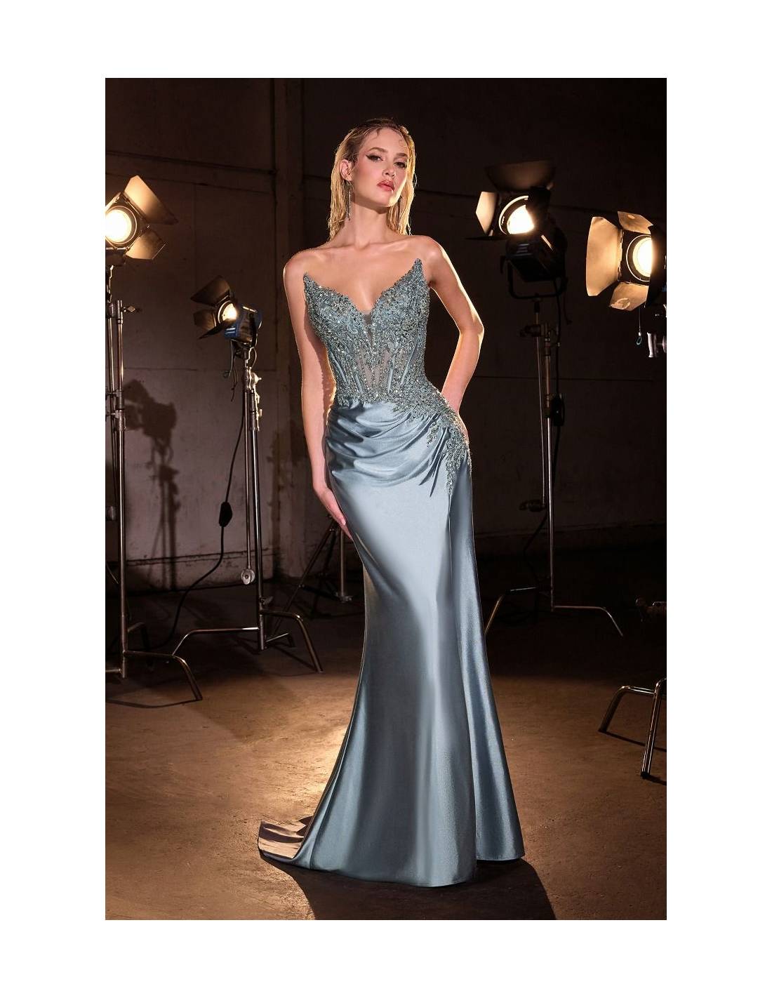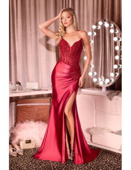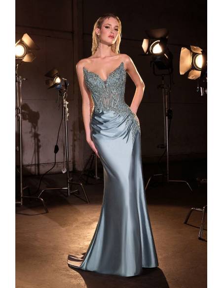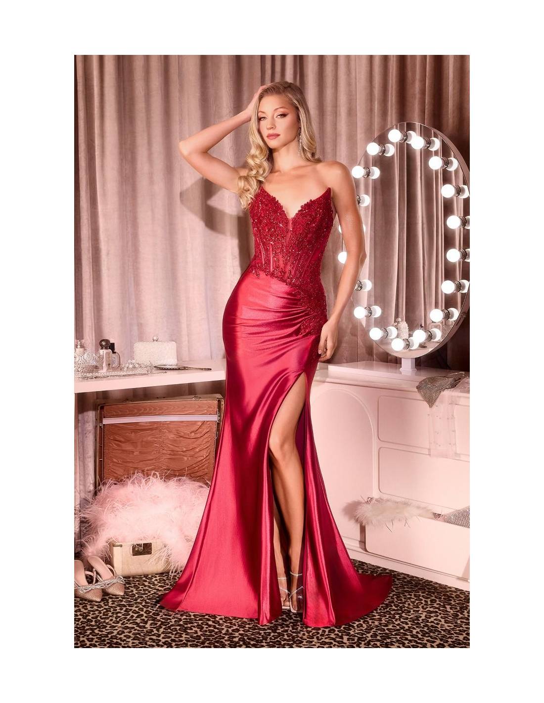 A glamorous red carpet dress that captures attention with its structured, beaded bodice. The sweetheart neckline features sheer, see-through details. Crafted from shimmering stretch satin, the dress hugs the entire silhouette and is complemented by a soft train for a touch of sophistication and impact. Ideal for any special event.