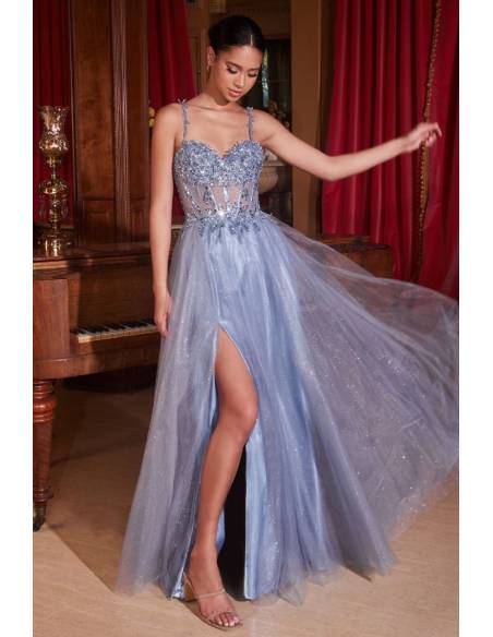 Abito per il tuo diciottessimo compleanno abito da principessa a trapezio con un corpetto in pizzo trasparente riccamente decorato . La gonna a strati in tulle con glitter brilla a ogni movimento, mentre uno spacco giocoso sulla gamba aggiunge un tocco sexy. Il corsetto posteriore con lacci assicura una linea sinuosa, trasformando questo abito in un sogno da favola.