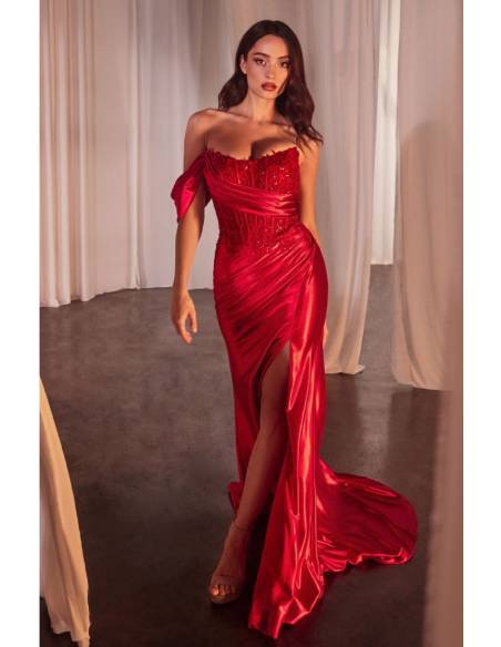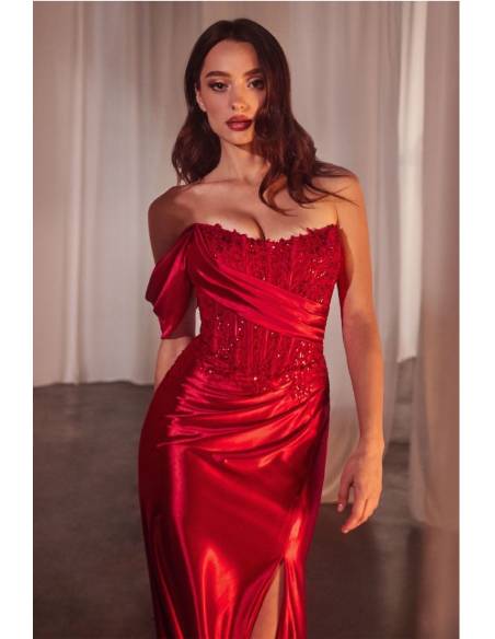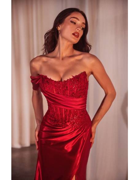 Splendido abito da sera in raso: un mix di eleganza e fascino che ti farà sentire radiosa e sicura di te. La silhouette aderente in raso avvolge le tue forme, accentuando la tua bellezza naturale a ogni passo. Il corpetto impreziosito in pizzo, con un'elegante scollatura, aggiunge un tocco di fascino romantico, mentre la fascia plissettata in raso si incrocia elegantemente in un'unica spallina, creando un accattivante look asimmetrico. Cattura l'attenzione rivelando l'affascinante dettaglio della schiena a V, che emana raffinatezza e grazia da ogni angolazione. Completato da una vita arricciata in raso e da un sensuale spacco sulla gamba.