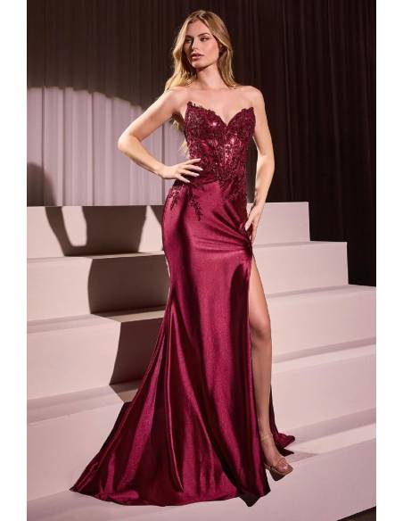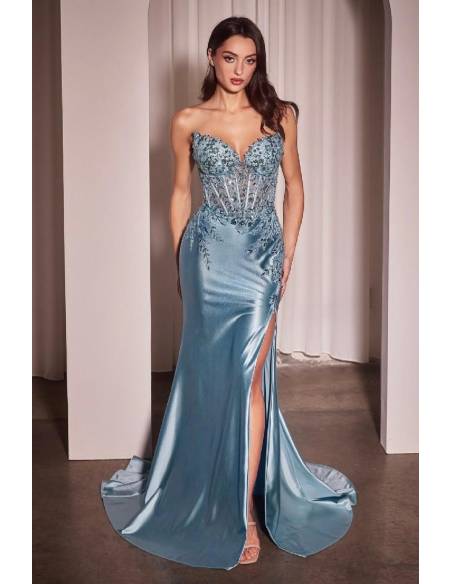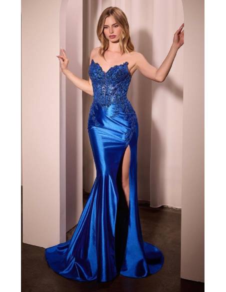 Abito aderente con scollatura a cuore senza spalline con  corsetto trasparente e applicazioni in pizzo, per un look accattivante ed elegante. Il corpetto strutturato offre un sostegno maggiore, mentre la gonna in raso crea una silhouette aderente e svasata. Perfetto per balli di fine anno, eventi formali e occasioni eleganti, abito raffinato e senza tempo.
