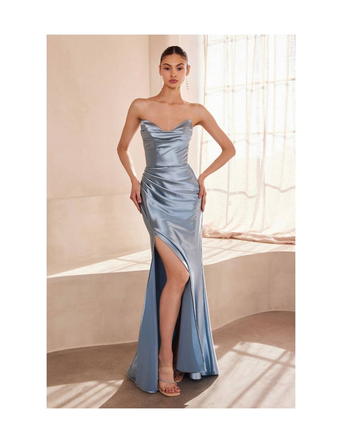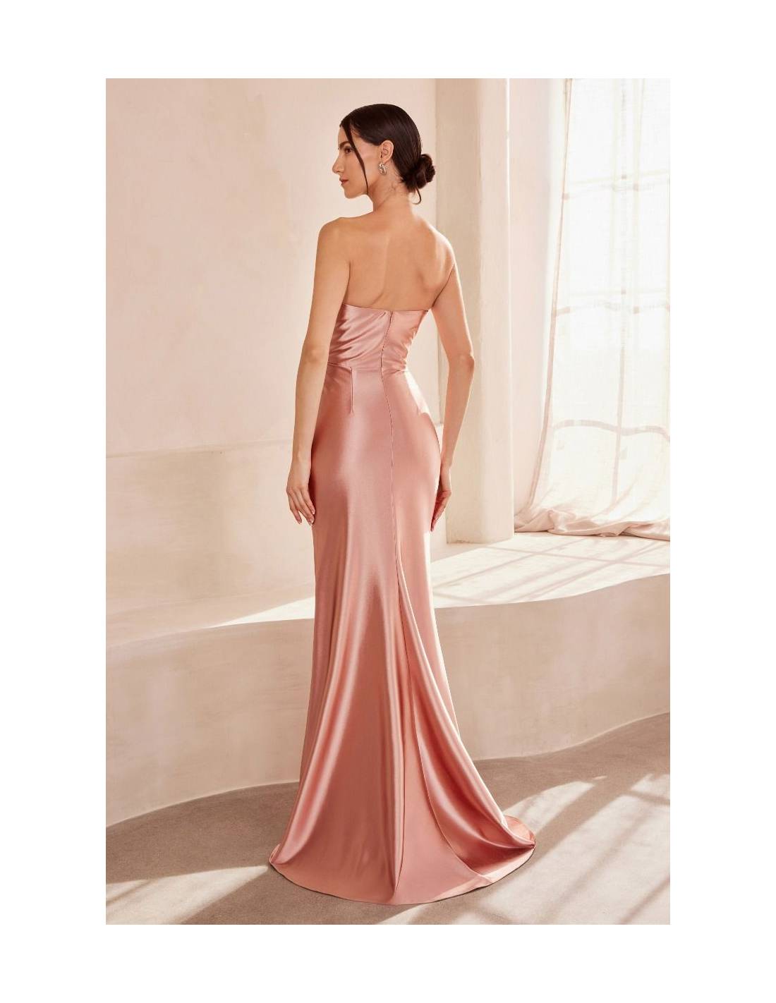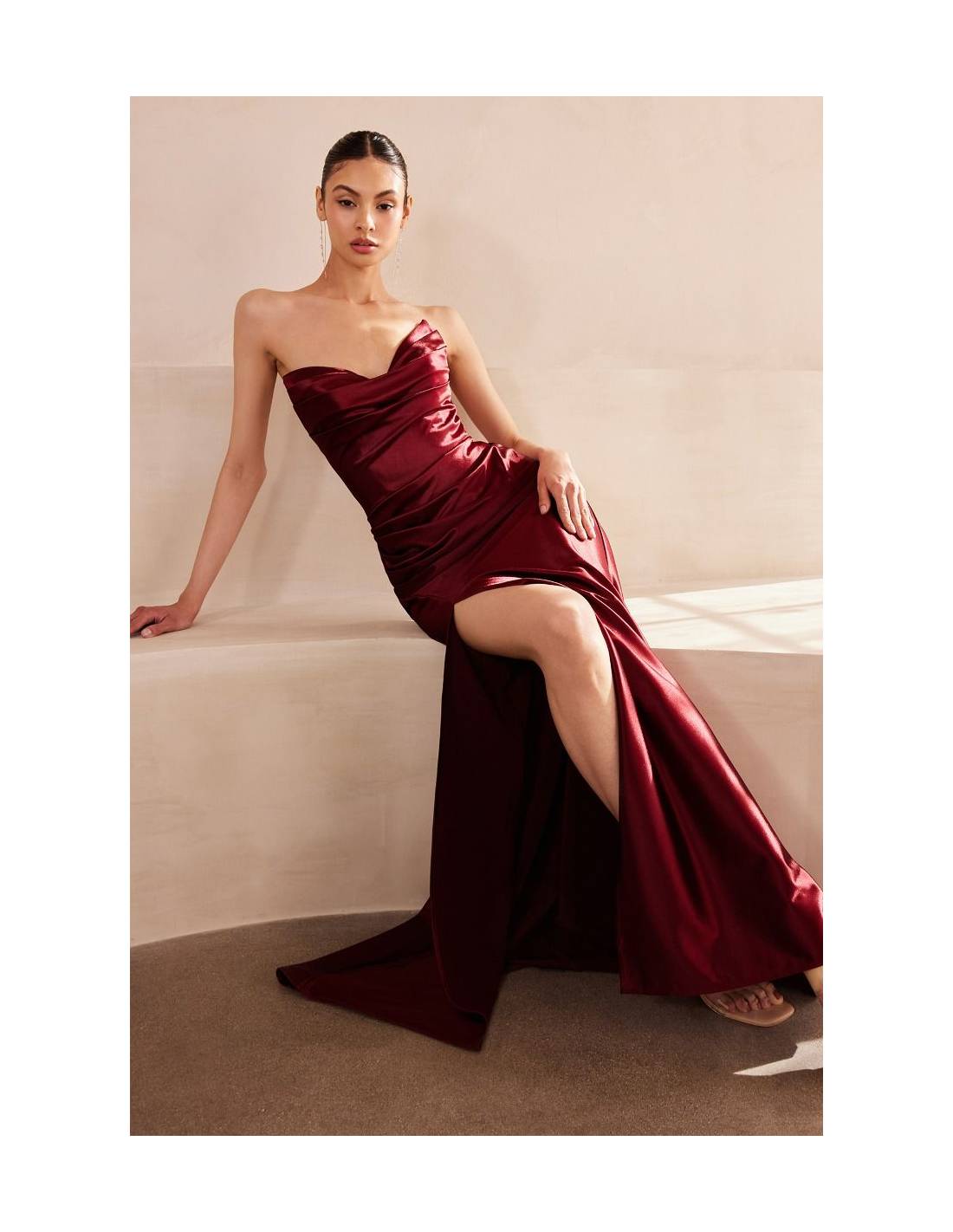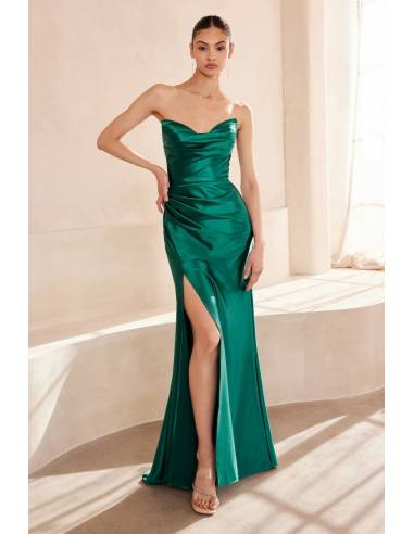 Abito aderente senza spalline con corsetto e scollatura dècolletè , fianchi arricciati che accentua la linea. Tessuto in raso semi-elastico evidenzia la figura ,lo spacco sulla gamba aggiunge un tocco di fascino. Perfetto come damigella d'onore o per un evento importante, questo abito assicura un look elegante e raffinato.