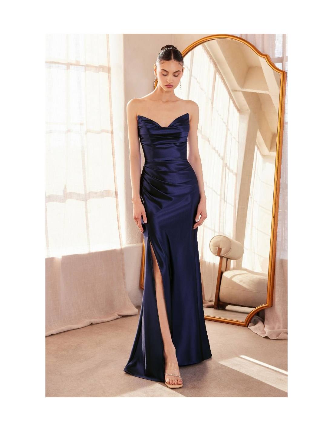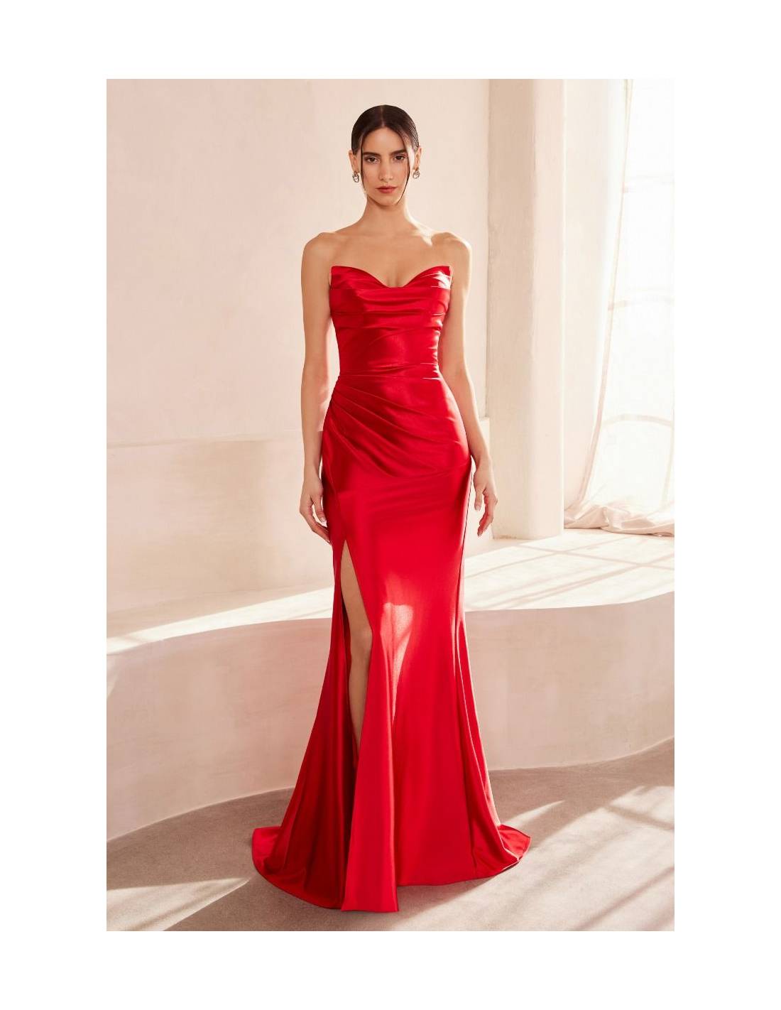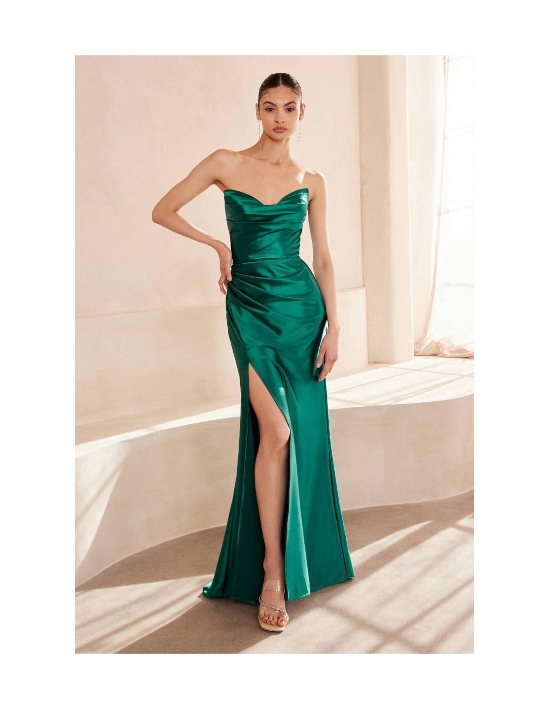 Abito aderente senza spalline con corsetto e scollatura dècolletè , fianchi arricciati che accentua la linea. Tessuto in raso semi-elastico evidenzia la figura ,lo spacco sulla gamba aggiunge un tocco di fascino. Perfetto come damigella d'onore o per un evento importante, questo abito assicura un look elegante e raffinato.