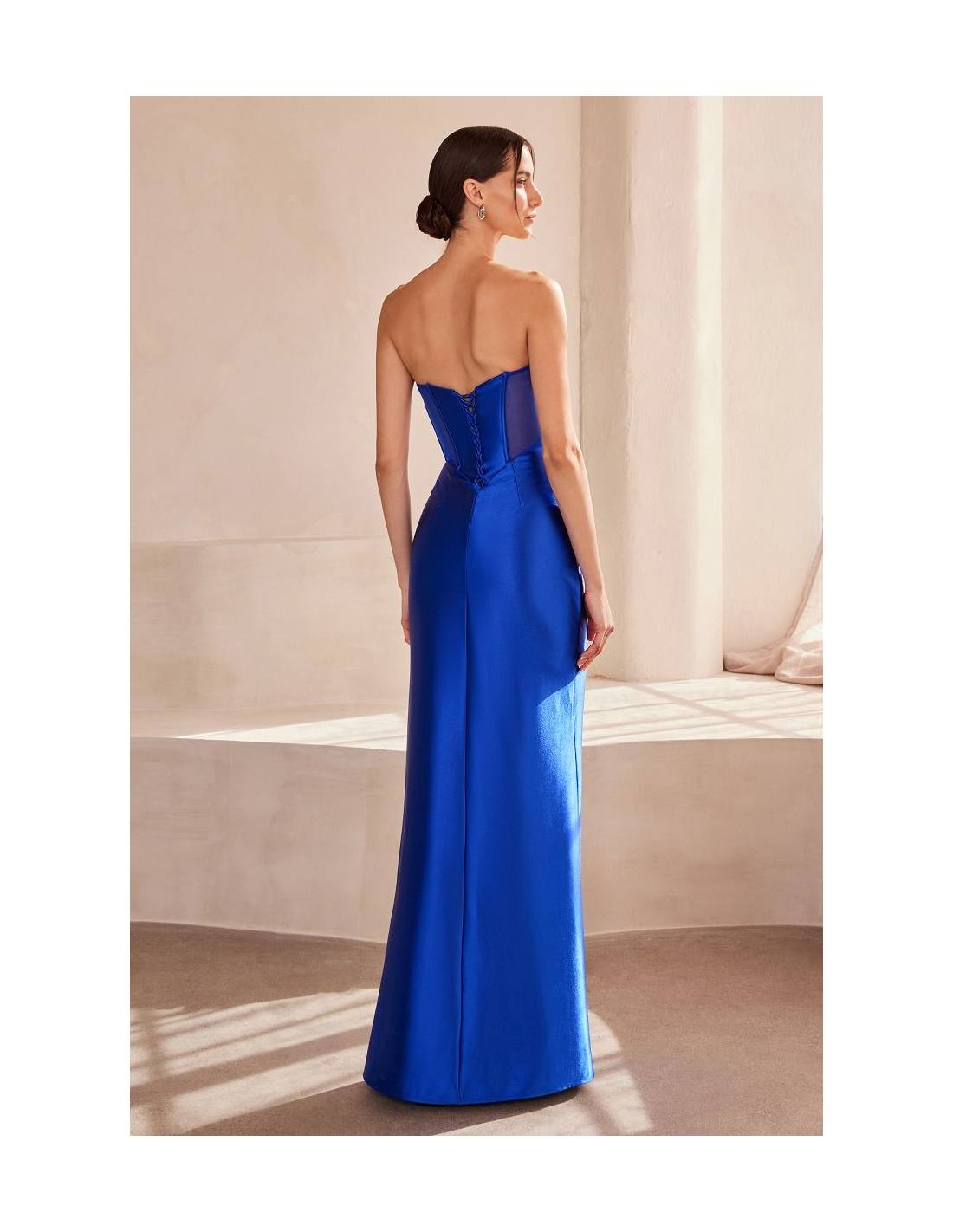 Abito aderente senza spalline scollatura a cuore e corpetto strutturato, disegnato per esaltare la silhouette. Il punto vita arricciato accentua con grazia le curve, mentre lo spacco sulla gamba aggiunge un tocco di fascino. Realizzato in morbido raso semi-elastico con schiena a corsetto con lacci, questo abito è una scelta straordinaria per eventi formali o in abito da sera.