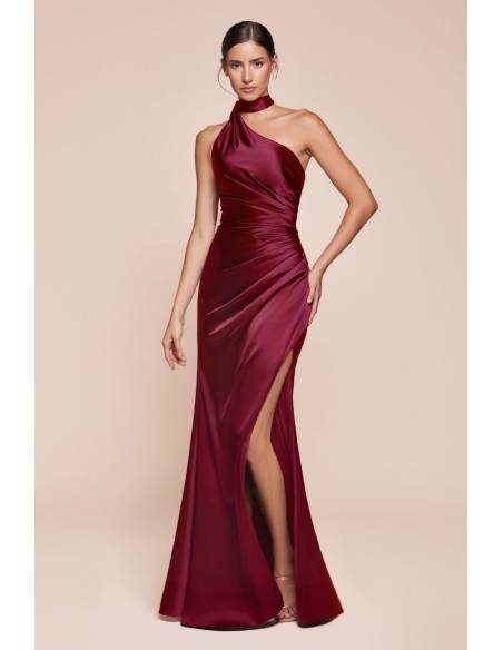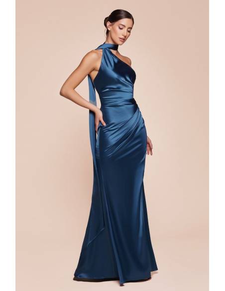 Abito monospalla con sciarpetta avvolta intorno al collo, un dettaglio sofisticato che esalta la raffinatezza della silhouette. La vita arricciata valorizza la figura, mentre lo spacco sulla gamba aggiunge un tocco di femminilità e movimento. Perfetto per damigelle d’onore, invitati a nozze ed eventi speciali.