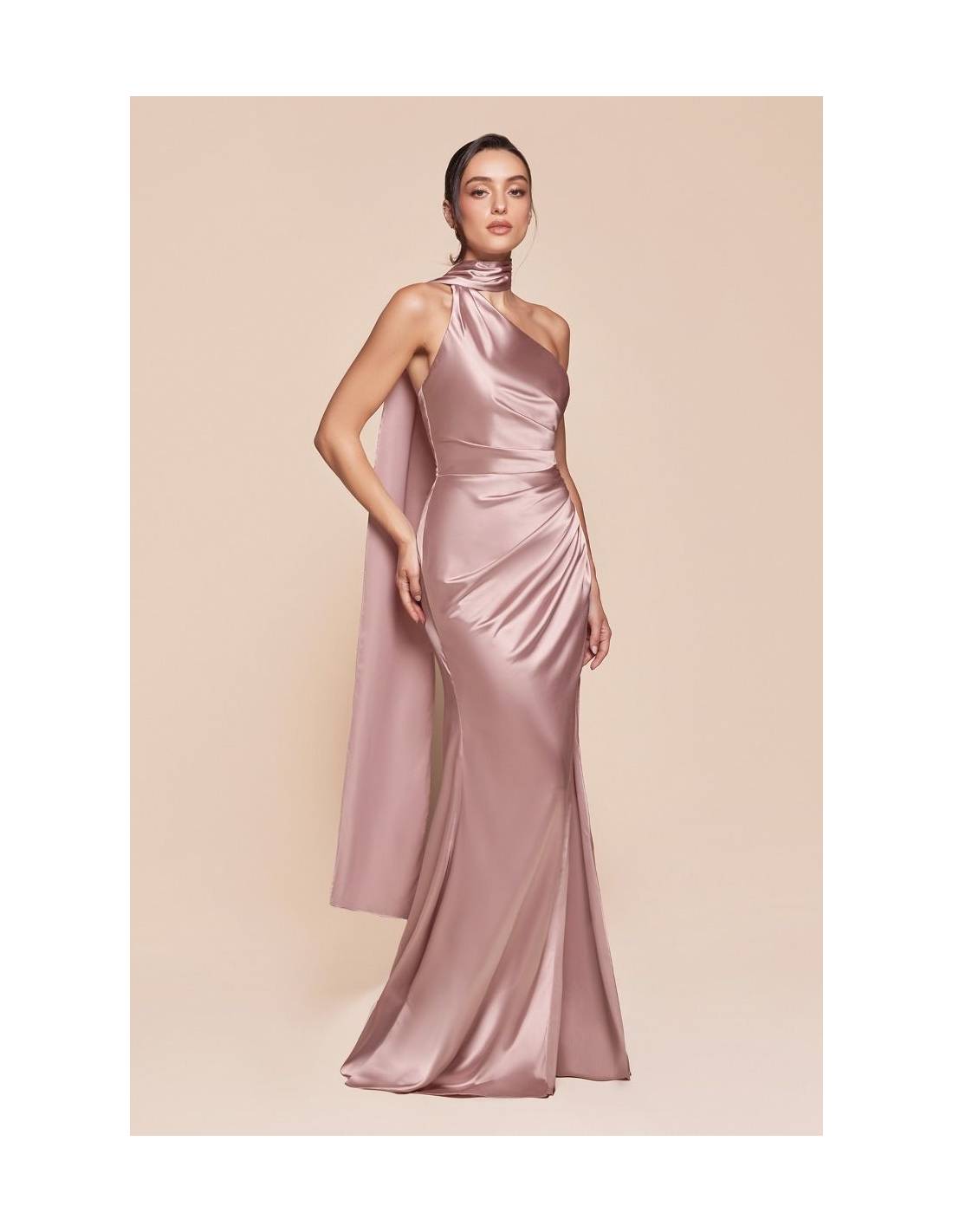 Abito monospalla con sciarpetta avvolta intorno al collo, un dettaglio sofisticato che esalta la raffinatezza della silhouette. La vita arricciata valorizza la figura, mentre lo spacco sulla gamba aggiunge un tocco di femminilità e movimento. Perfetto per damigelle d’onore, invitati a nozze ed eventi speciali.