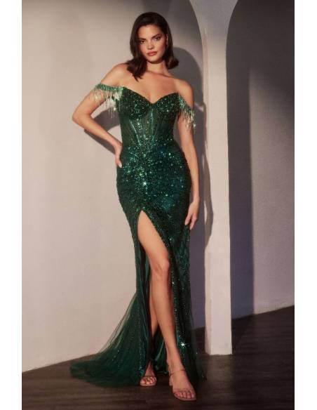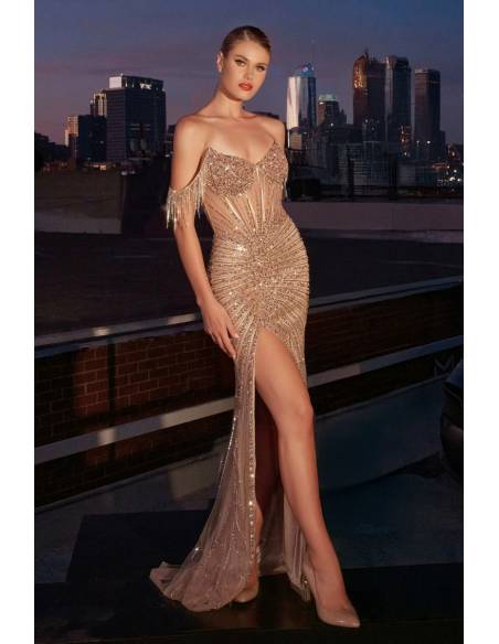 Abito glamour con scollatura a spalle scoperte con frange e  corpetto trasparente  riccamente decorato con perline. La silhouette aderente e svasata esalta la tua figura, mentre lo spacco sulla gamba aggiunge un tocco di eleganza. Perfetto per balli di fine anno, eventi formali o première sul red carpet, questo modello abbagliante è una celebrazione del glamour senza tempo.