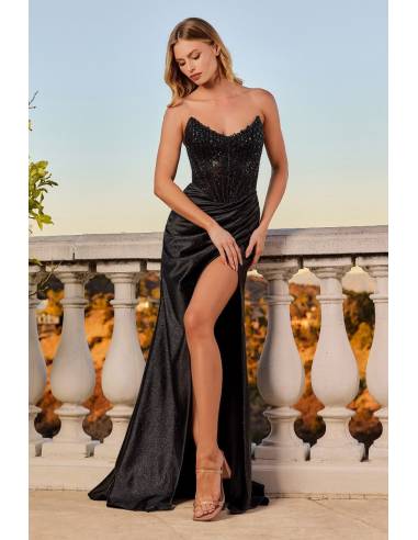 Abito aderente senza spalline con scollatura dècolletè  e corpetto decorato che irradia eleganza. La gonna in raso glitterato e l'elegante spacco sulla gamba, slancia con grazia la silhouette, esaltando l'insieme. Perfetto per il tuo diciottesimo, per eventi formali o in abito da sera, questo stile ti offre  raffinatezza senza tempo, con un tocco di brillantezza.