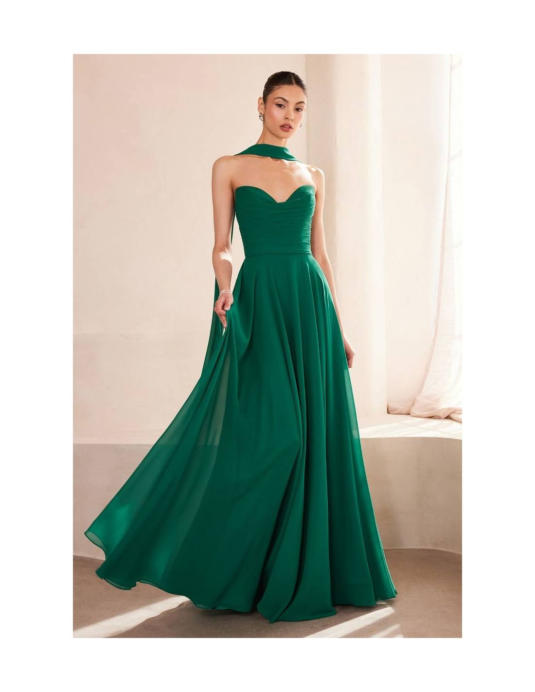 Questo elegante abito a trapezio presenta una scollatura a cuore senza spalline e un drappeggio sul davanti per un look morbido e romantico. Il corpetto aderente con schiena a corsetto allacciata offre struttura e una vestibilità personalizzata, mentre la gonna fluida si muove con grazia a ogni passo. Completato da un delicato foulard, questo abito è perfetto per matrimoni, damigelle d'onore o qualsiasi evento formale.