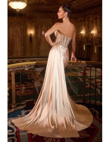 Abito aderente, caratterizzato da una scollatura a cuore senza spalline e da un corpetto decorato con perline di cristallo che cattura la luce a ogni movimento. La gonna in raso presenta un audace spacco sulla gamba con una fascia laterale aggiungendo un tocco di eleganza alla silhouette . Il corsetto strutturato allacciato sulla schiena  sostiene perfettamente il busto con raffinatezza.Lo stile perfetto per il tuo diciottesimo,per la tua sfilata o per il tuo evento speciale.
