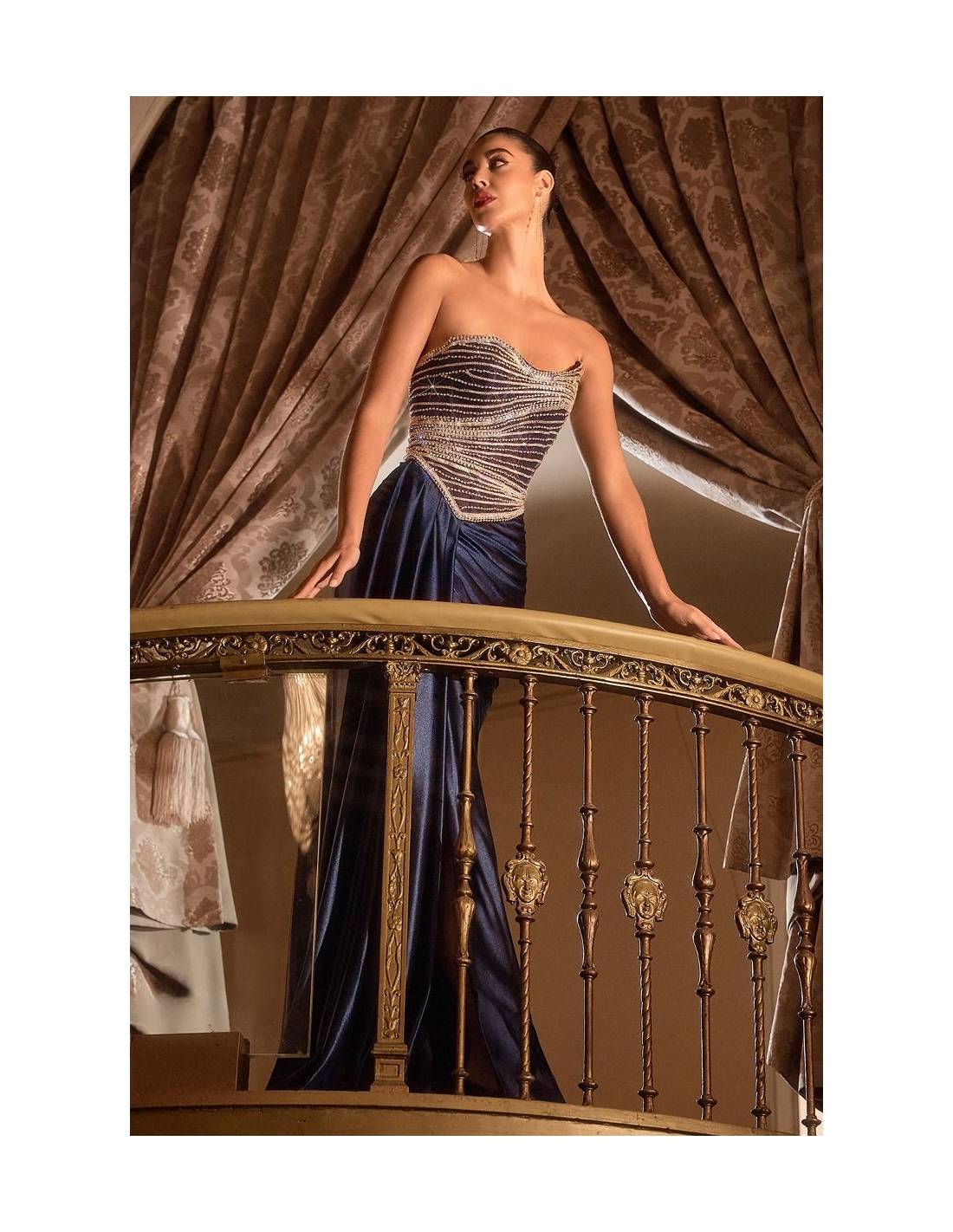 Silhoulette aderente,scollatura senza spalline ,corpetto scintillante, spacco alto sulla gamba ideale per il tuo evento.