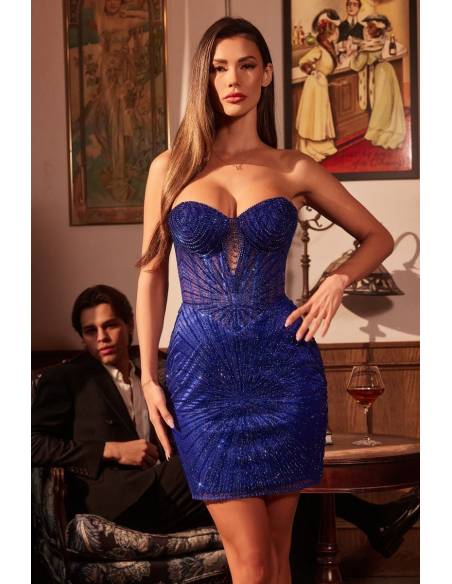 Mini abito aderente con scollatura a cuore senza spalline e uno splendido motivo di perline che aggiunge un elegante tocco di brillantezza. Realizzato in tessuto stampato glitterato, unisce glamour e raffinatezza, mentre il corsetto strutturato allacciato dietro ha sostegno  e una vestibilità perfetta.I'abito è perfetto per cocktail party, ricevimenti o una serata fuori, offrendo un look chic e di grande impatto.