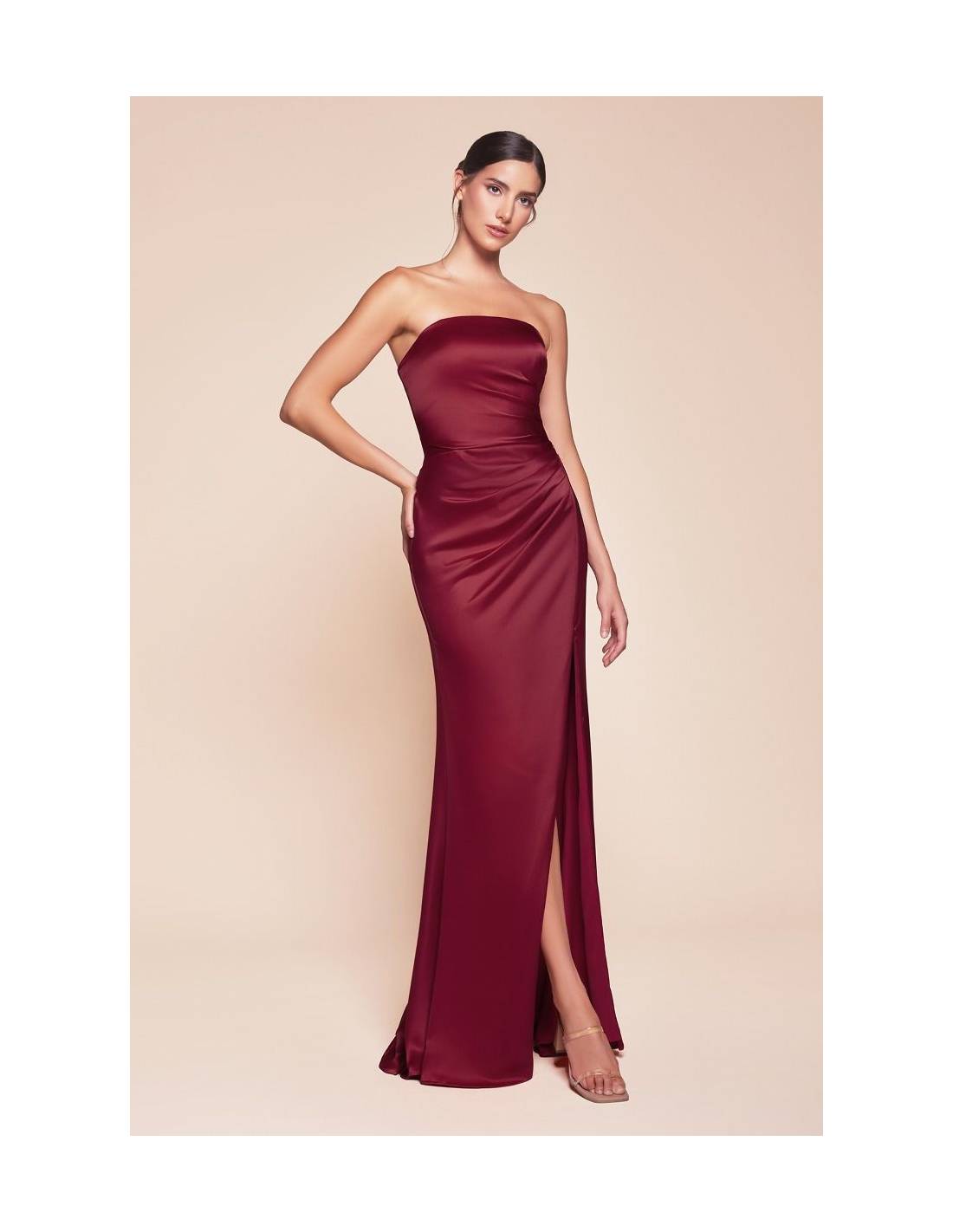 Abito aderente  senza spalline, realizzato in raso, con un'elegante scollatura,una vita arricciata e un elegante spacco sulla gamba. Il corpetto aderente allacciato nella  schiena ha un perfetto sostegno e raffinatezza. Ideale per damigelle, invitati a un matrimonio o per qualsiasi evento formale, questo abito offre un'eleganza senza tempo