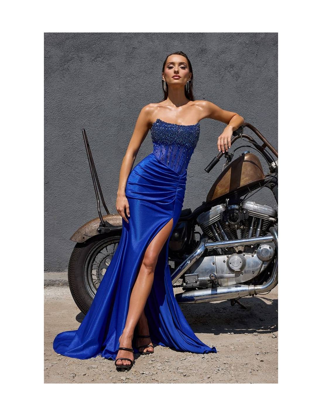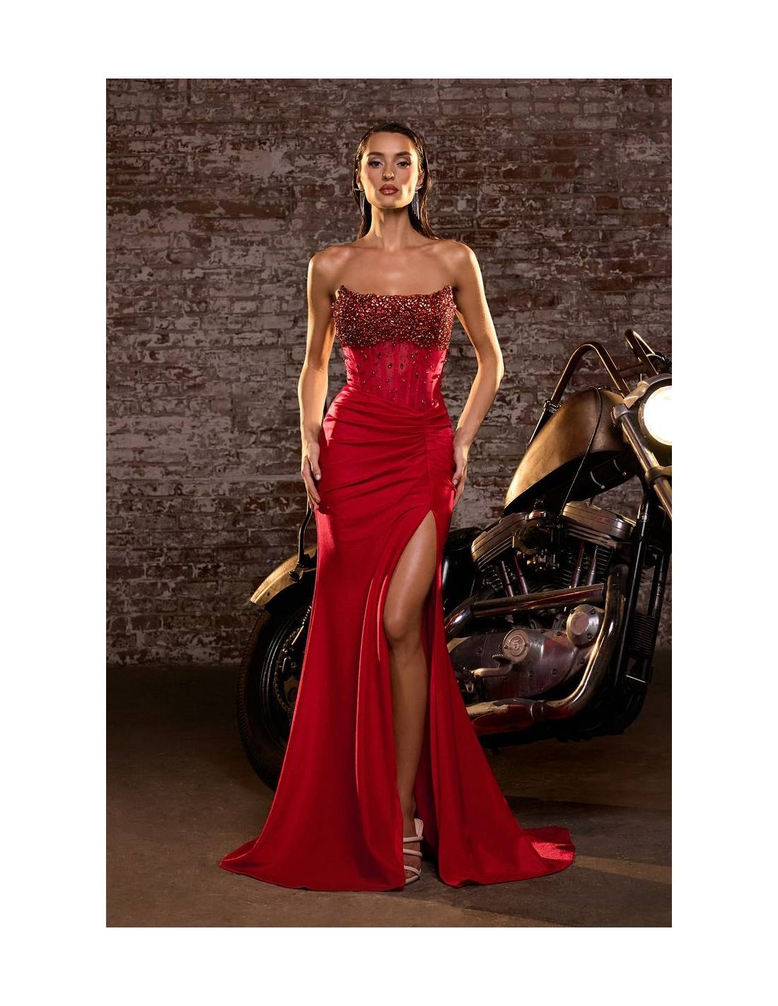 Abito per il tuo evento audace e indimenticabile,  aderente con un impatto altamente glamour e un tocco di couture. Il corpetto trasparente senza spalline è impreziosito da scintillanti decorazioni in strass e perline, che delineano il busto con stecche strutturate e trasparenti effetto sensuale. Uno spettacolare spacco profondo e un dettaglio drappeggio sui fianchi esaltano la silhouette, tessuto in raso elasticizzato e glitterato scende fluidito e lucente. Qualunque sia il colore scelto, questo modello è stato creato per rubare la scena , concorsi di bellezza o eventi sul red carpet.
